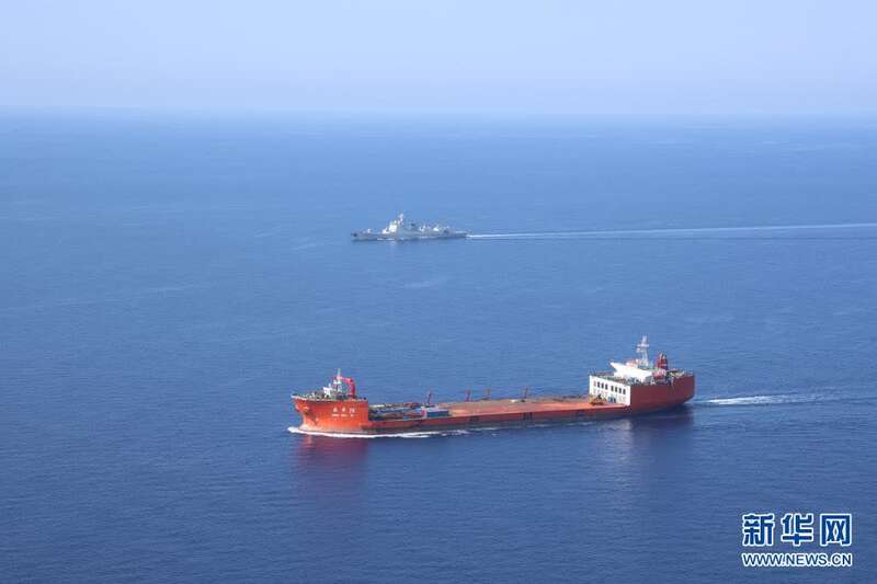 中国海军第37批护航编队长沙舰(后)为中国“振华28号”商船伴随护航(5月28日摄)。新华社发(王健 摄)