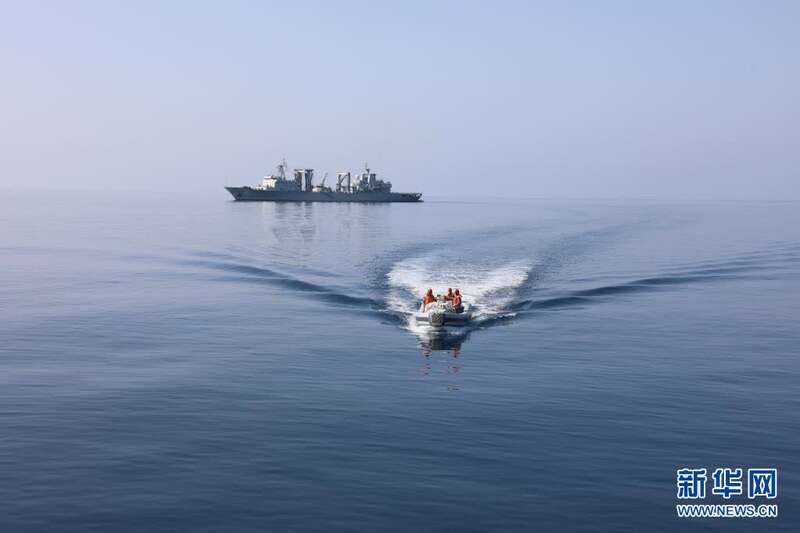 中国海军第37批护航编队组织海上航行补给,为舰艇连续执行护航任务提供可靠续航支持。这是小艇在进行物资转运(3月22日摄)。新华社发(王健 摄)