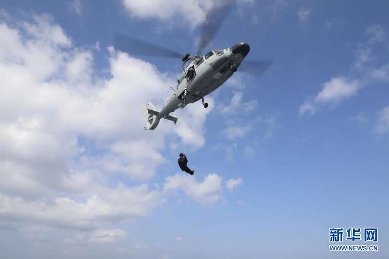 中国海军第37批护航编队组织直升机索降训练,特战队员从直升机上索降下滑(2月18日摄)。新华社发(王健 摄)