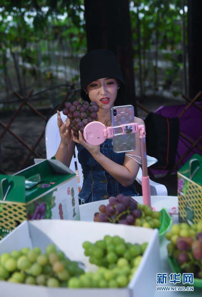 8月13日,在杭州市富阳区东洲街道陆家浦村天府葡萄园,主持人在网络平台上进行直播销售。