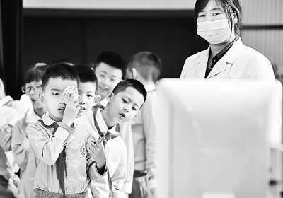 在河北省沧州市实验小学,医生志愿者指导学生进行裸眼视力检查。傅新春摄/光明图片
