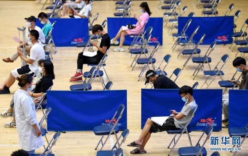 8月15日,在宁夏银川市金凤区新冠疫苗方舱接种点,接种后的学生在留观区等候。