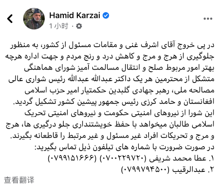 阿富汗前总统卡尔扎伊当地时间8月15日晚在其社交媒体账户宣布,鉴于阿富汗总统加尼先生和其他官员已离开阿富汗,为了防止混乱和减轻人民苦难,他本人将同民族和解高级委员会主席阿卜杜拉等人成立一个协调委员会负责相关交接事宜。并同时公布了相关联系人电话。