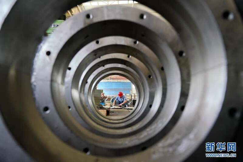 8月19日,位于玉田县的唐山东亚重工装备集团有限公司工人在查验大型传输设备零部件。