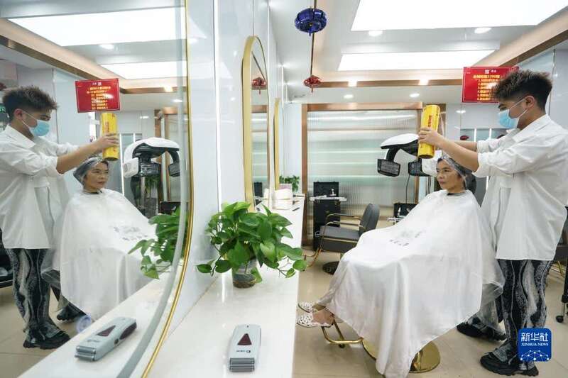 8月26日,江宁区禄口街道居民在一家理发店护理头发。新华社记者 季春鹏 摄