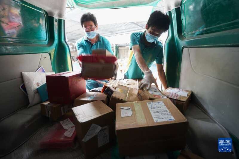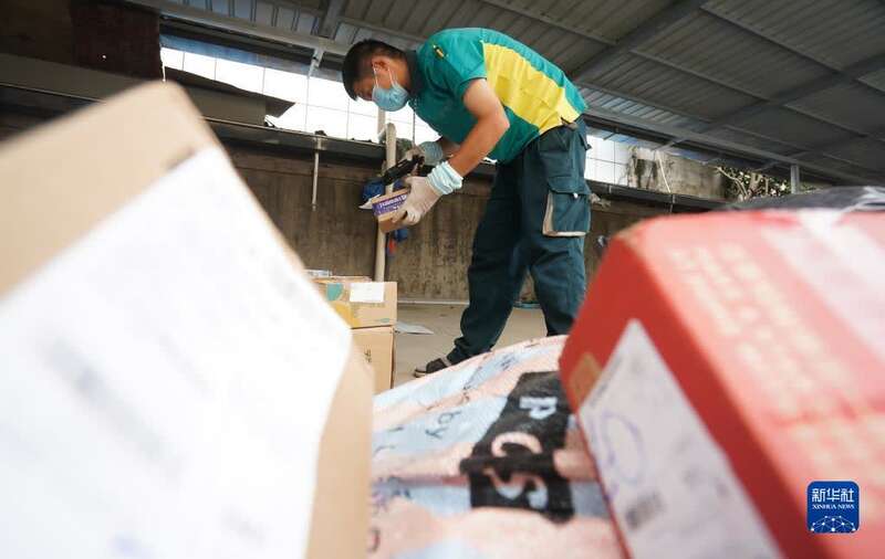 8月26日,在江宁区禄口街道一处邮政快递投递部,工作人员在装运快递。新华社记者 季春鹏 摄