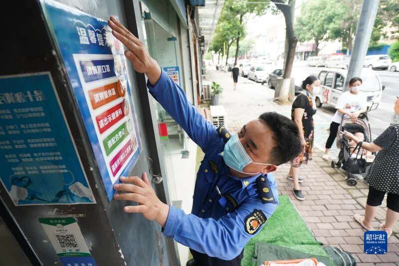 8月26日,江宁区禄口街道城管工作人员在张贴温馨提示。新华社记者 季春鹏 摄
