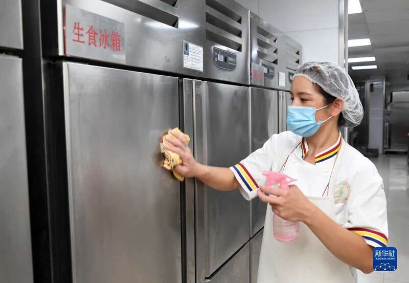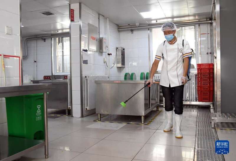8月26日,在北京市海淀区太平路小学,工作人员对食堂厨房进行消毒。新华社记者 任超 摄