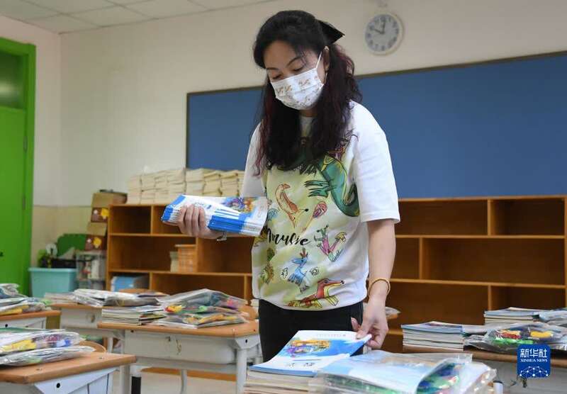 8月26日,在北京市海淀区太平路小学,教师整理分发好的新学期教材。新华社记者 任超 摄