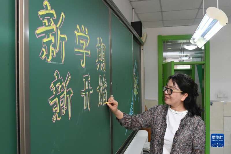 8月26日,在北京市海淀区太平路小学,教师在教室里书写新学期寄语。新华社记者 任超 摄