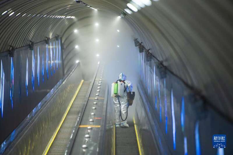 8月26日,在张家界天门山景区登天门扶梯,工作人员在给扶梯消毒。新华社记者 陈思汗 摄