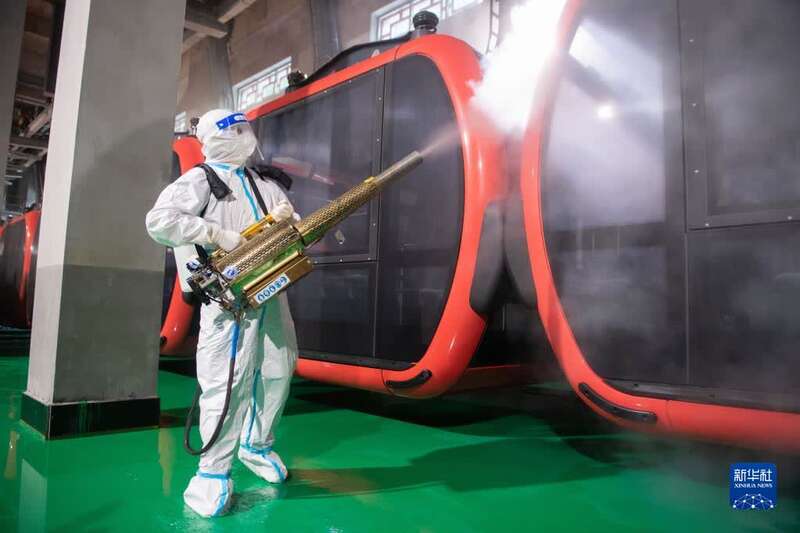 8月26日,在张家界天门山景区天门洞快线索道站,工作人员给缆车外部消毒。新华社记者 陈思汗 摄