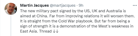 雅克发推说:“美、英、澳签署的新军事协定针对的是中国。这非但不会改善关系,反而会使关系恶化。它直接照搬了冷战的剧本。但这远不是实力的象征,而是西方在东亚的弱化表现。”↓