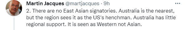 雅克进一步表示,“并没有东亚国家签署(美英澳协定)。澳大利亚离(东亚)最近,但该地区将其视为美国的走狗。澳大利亚几乎没有来自该地区的支持。其被视为西方国家而非亚洲国家。”↓