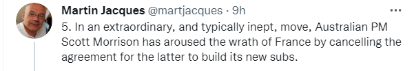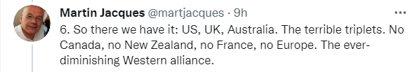 雅克总结说:“因此,我们有了它:美国、英国、澳大利亚,可怕的三胞胎。没有加拿大,没有新西兰,没有法国,没有欧洲。不断削弱的西方联盟。”↓