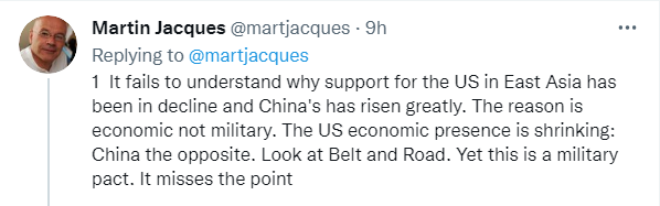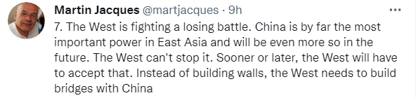 雅克在最后一条推文中总结观点:“西方正在打一场败仗。中国目前是东亚地区最重要的力量,未来更是如此。西方阻止不了。西方迟早要接受这一点。西方需要与中国架起桥梁,而不是筑起高墙。”↓