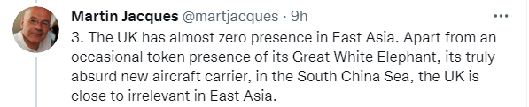 “英国在东亚的存在感几乎为零”,雅克接着写道,除了偶尔象征性地出现在南海的航母,“英国在东亚几乎是毫不紧要的”。↓