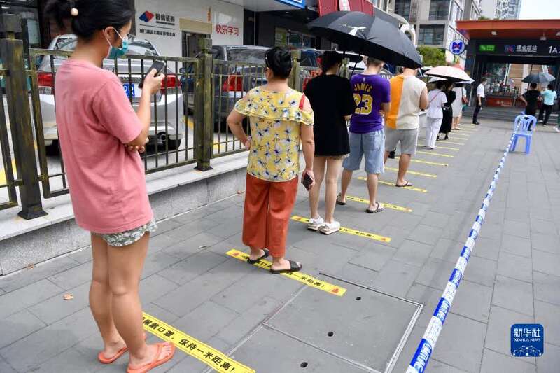 9月18日,厦门一社区核酸检测点市民排队等待核酸取样。