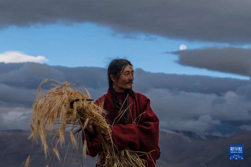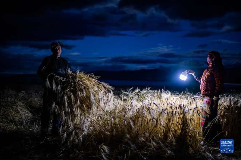 9月23日清晨,西藏那曲市尼玛县文部乡文部南村村民开镰收割。新华社记者 普布扎西 摄