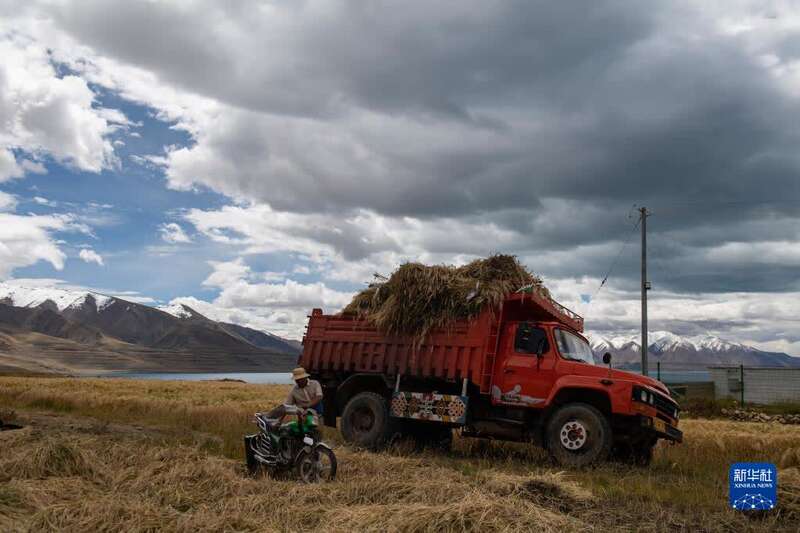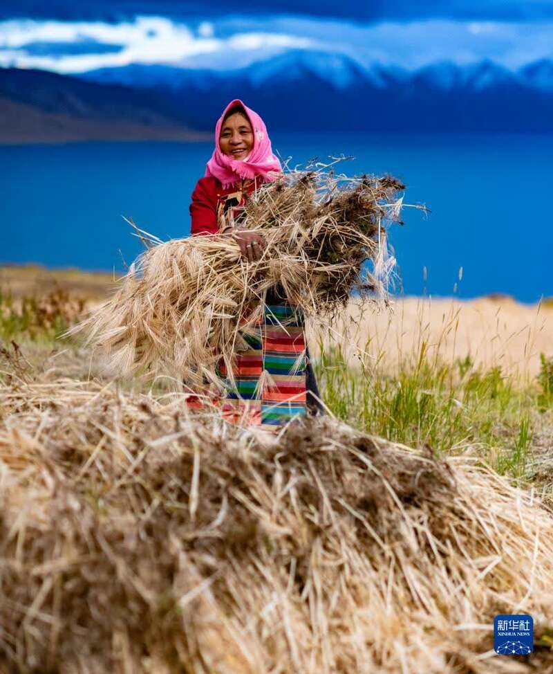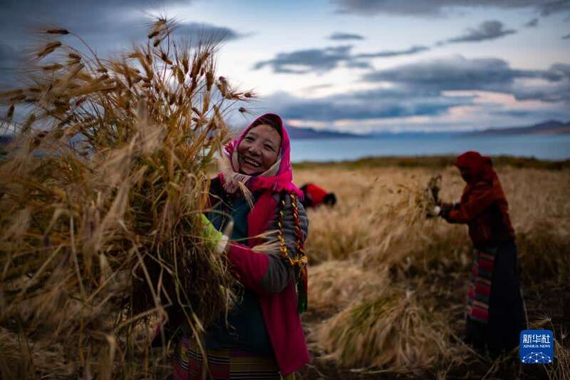 9月23日,西藏那曲市尼玛县文部乡文部南村村民开镰收割农田里的青稞。文部乡文部南村位于当惹雍措湖畔,海拔4645米,这里的村民以“萨马卓”(半农半牧之意)为主,在藏北高原独具特色。