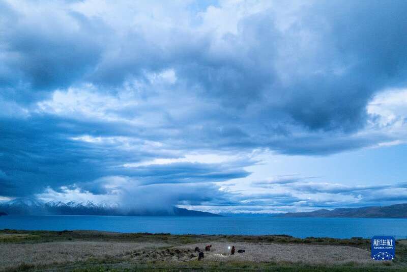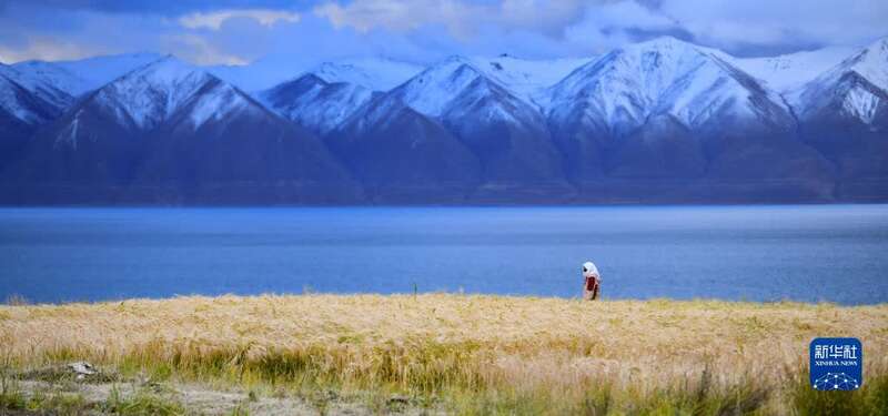 9月23日在西藏那曲市尼玛县文部乡文部南村拍摄的金色的青稞和雪山湖泊。新华社记者 晋美多吉 摄