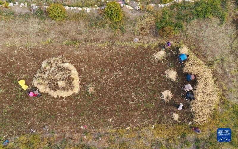 9月23日清晨,西藏那曲市尼玛县文部乡文部南村村民开镰收割(无人机照片)。新华社记者 晋美多吉 摄