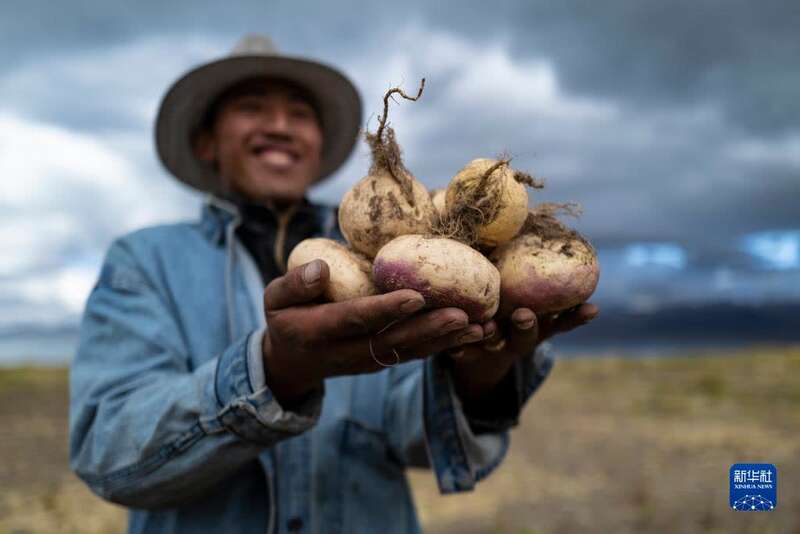 9月23日,西藏那曲市尼玛县文部乡文部南村村民展示收获的芫根。新华社记者 孙瑞博 摄