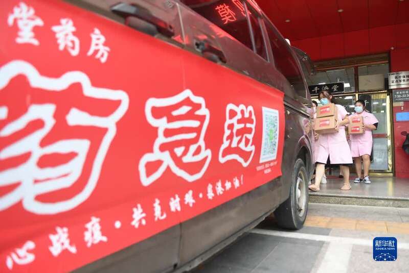 9月23日,药店工作人员将群众通过 “康急送”云守护平台购买的药品搬到药品发送车上。新华社记者 林善传 摄