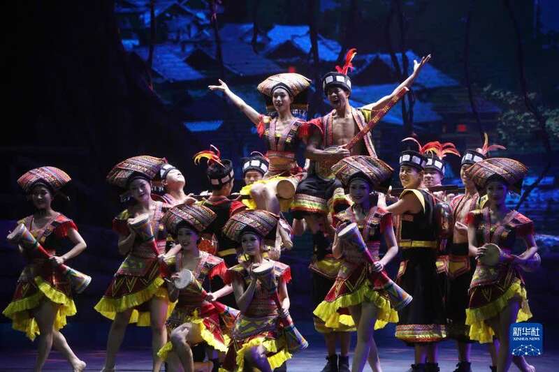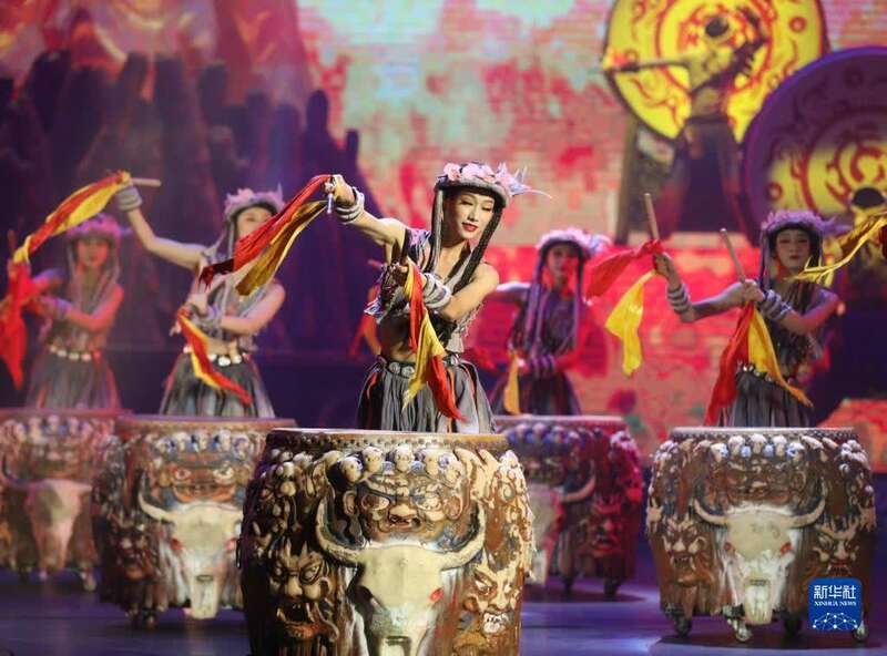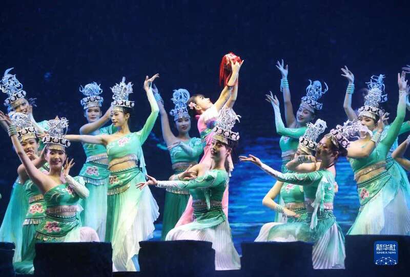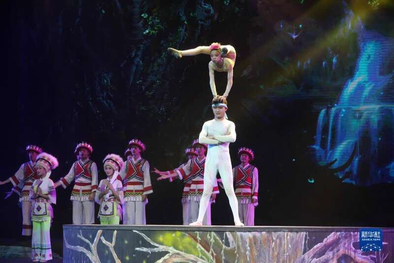 9月22日晚,湖南张家界魅力湘西艺术团的演员在舞台上表演。新华社发(吴勇兵 摄)