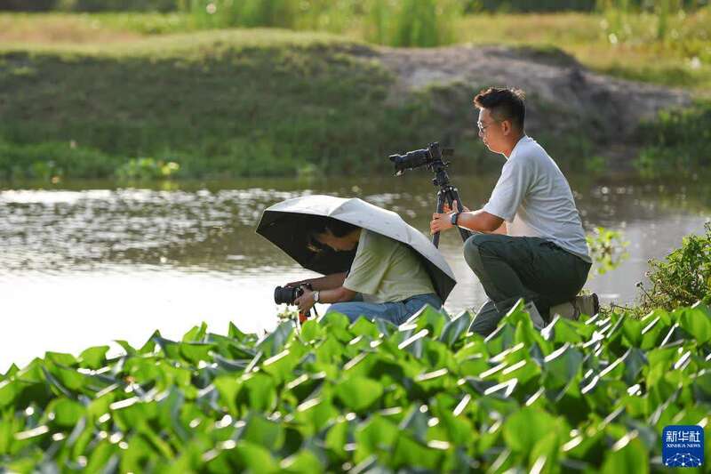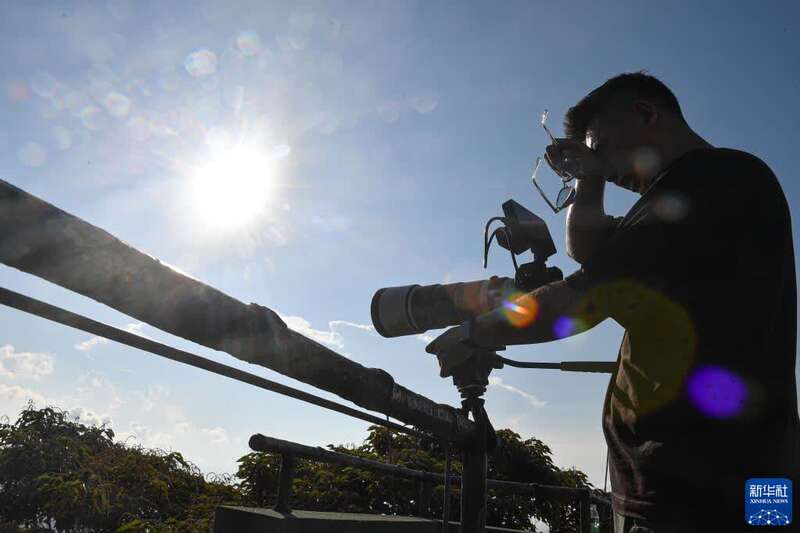 9月18日,关天宇在海南文昌铜鼓岭为拍摄天舟三号货运飞船发射踩点,强烈的阳光让他不住地擦汗。新华社记者 蒲晓旭 摄