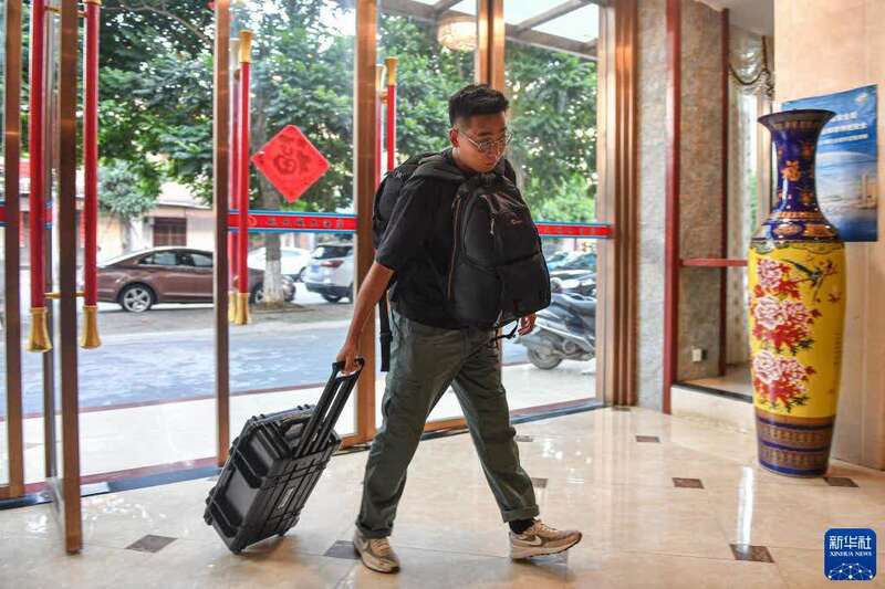 9月18日,26岁的航天摄影发烧友关天宇背着行囊,拉着设备走入海南文昌一家酒店。关天宇来自新疆,是一名自由摄影师,这是他第三次拍摄火箭发射。新华社记者 蒲晓旭 摄