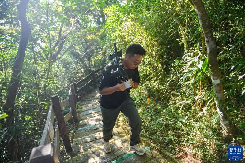 9月18日,在海南文昌的酒店入住后,关天宇扛着设备爬上文昌铜鼓岭为拍摄天舟三号货运飞船发射踩点。新华社记者 蒲晓旭 摄