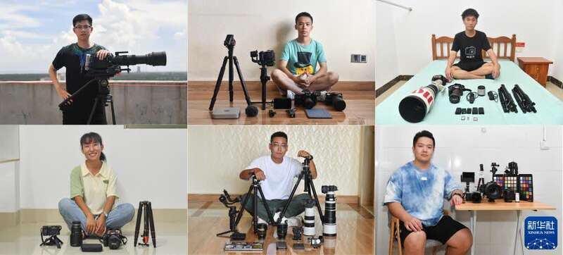 拼版照片:上左为金昱昌在海南文昌一处屋顶展示他为拍摄天舟三号货运飞船发射而购置的电影摄影机(9月19日摄);上中为杨昊在海南文昌一家酒店内展示他为拍摄天舟三号货运飞船发射准备的设备(9月19日摄);上右为梁子轩在他暂住的海南文昌一家公寓内展示他为拍摄天舟三号货运飞船发射携带的装备(9月18日摄);下左为付悦欣在海南文昌一处公寓内展示她为拍摄天舟三号货运飞船发射准备的设备,24岁的她是海南大学一名在读研究生(9月19日摄);下中为关天宇在他入住的海南文昌一家酒店内展示他为拍摄天舟三号货运飞船发射携带的装备(9月19日摄);下右为陈玉成在海南文昌一处公寓内展示他为拍摄天舟三号货运飞船发射准备的装备(9月18日摄)。新华社记者 蒲晓旭 摄