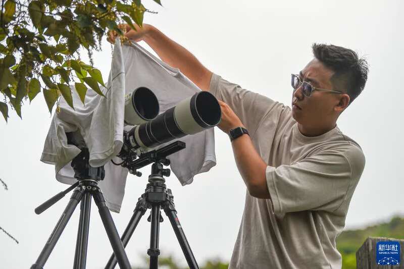 9月20日,天舟三号货运飞船发射前6小时,航天摄影发烧友关天宇在文昌铜鼓岭架好拍摄设备,并特意为设备盖上一件衣服,以防其因长时间暴晒而损坏。新华社记者 蒲晓旭 摄