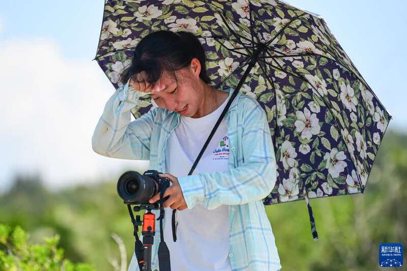9月20日,天舟三号货运飞船发射前5小时,航天摄影发烧友付悦欣在海南文昌一处毫无遮蔽的海边等待拍摄。烈日当头,她不停地淌汗。新华社记者 蒲晓旭 摄