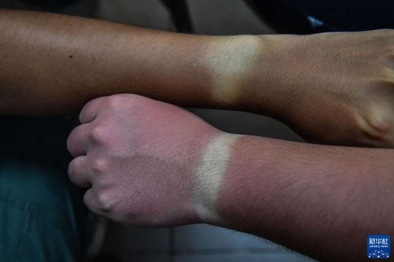 9月20日,在拍摄天舟三号货运飞船发射结束后,航天摄影发烧友关天宇和陈玉成比较他们各自晒出的手表印。新华社记者 蒲晓旭 摄