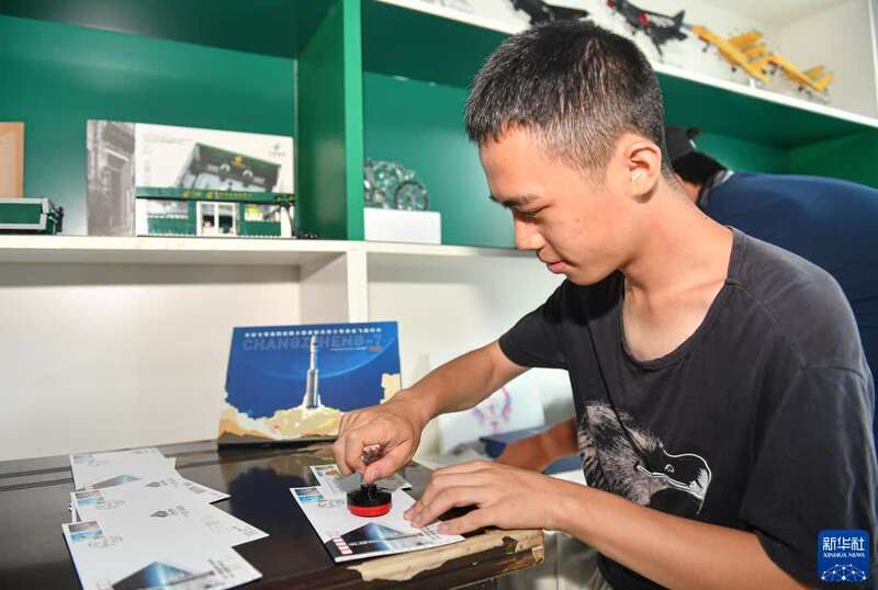 9月21日,天舟三号货运飞船发射次日,杨昊和同伴前往文昌航天邮局为自己和其他航天摄影发烧友购买首日封并盖上纪念邮戳。新华社记者 蒲晓旭 摄