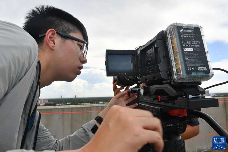 9月19日,天舟三号货运飞船发射任务执行前日,航天摄影发烧友金昱昌在海南文昌一处屋顶调试他为拍摄这次发射而购置的电影摄影机。新华社记者 蒲晓旭 摄