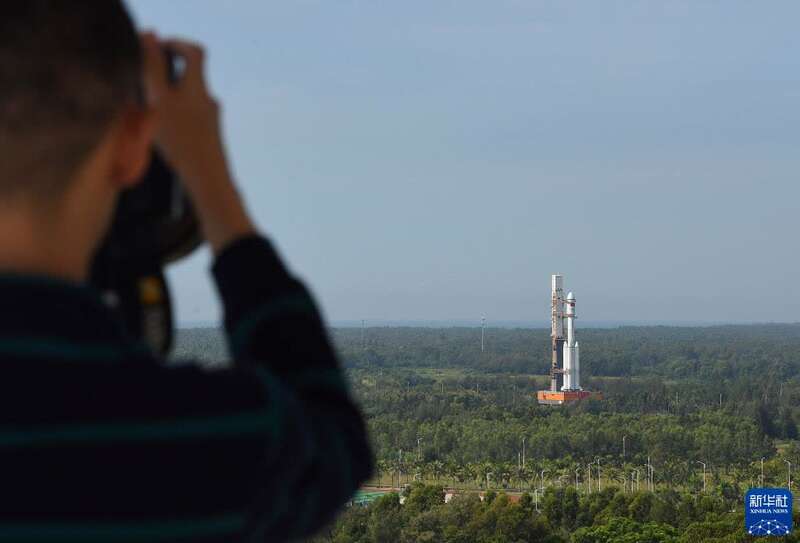 9月16日,航天摄影发烧友胡应南在海南文昌一幢公寓楼顶拍摄天舟三号货运飞船船箭组合体垂直转运过程。新华社记者 蒲晓旭 摄
