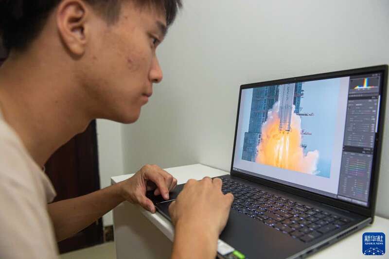 9月20日,在完成对天舟三号货运飞船发射过程的拍摄后,航天摄影发烧友梁子轩在海南文昌暂住的公寓内对拍摄的照片进行后期处理。新华社记者 蒲晓旭 摄
