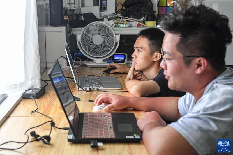 9月21日,天舟三号货运飞船发射次日,航天摄影发烧友杨昊(左)和陈玉成在海南文昌对拍摄的素材进行后期处理。新华社记者 蒲晓旭 摄