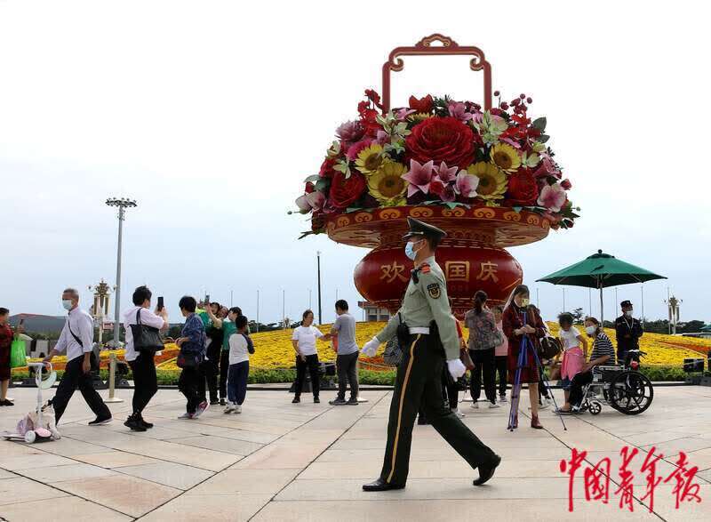 9月25日,北京天安门广场,游客从“祝福祖国”中心花篮前走过。中青报·中青网记者 陈剑/摄
