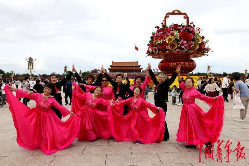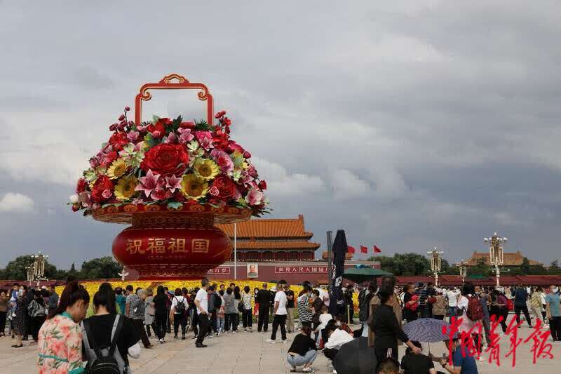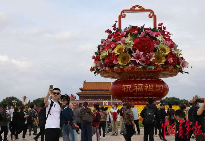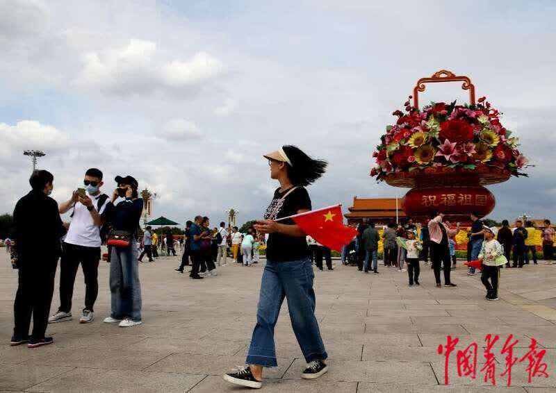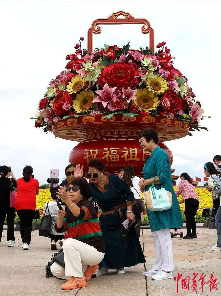 9月25日,北京天安门广场,游客在“祝福祖国”中心花篮前合影留念。中青报·中青网记者陈剑/摄