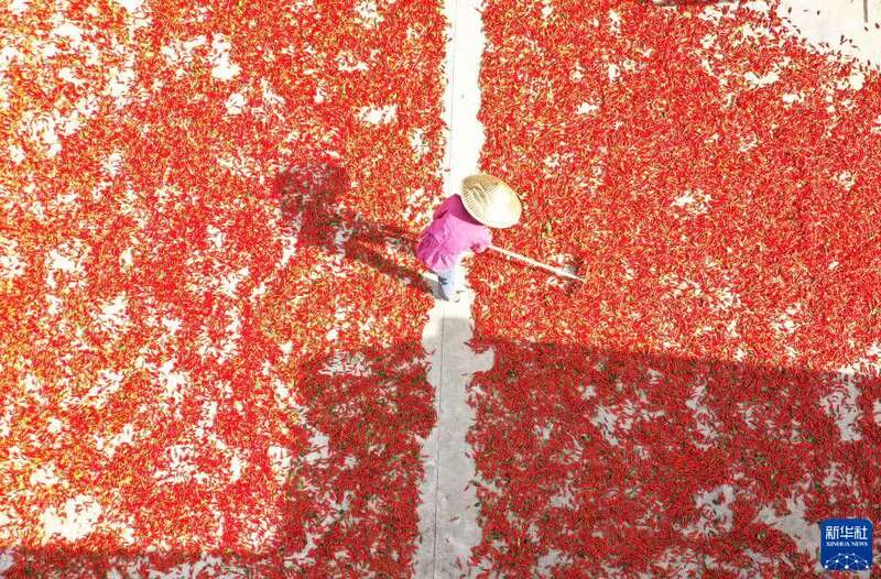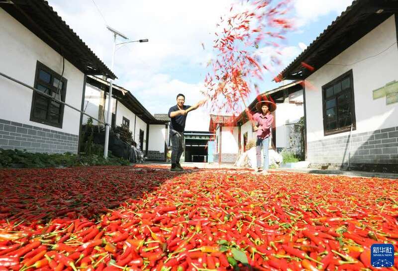 9月23日,在道真县忠信镇水石脚村,农民在晾晒辣椒。新华社发(王长育 摄)