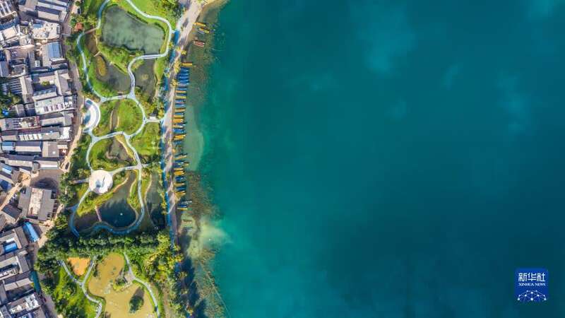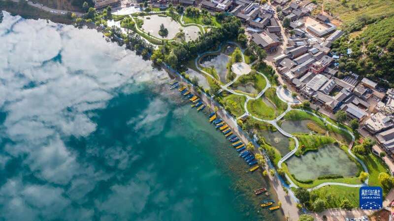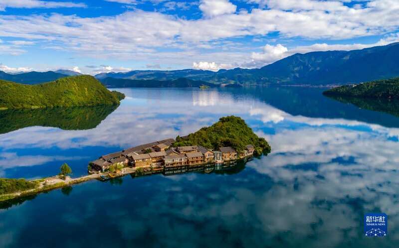 9月24日拍摄的泸沽湖和周边的村庄景象(无人机照片)。新华社记者胡超 摄