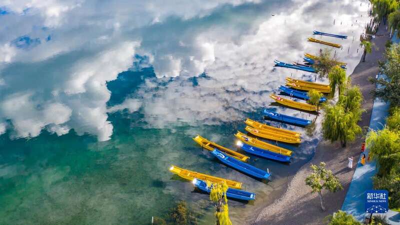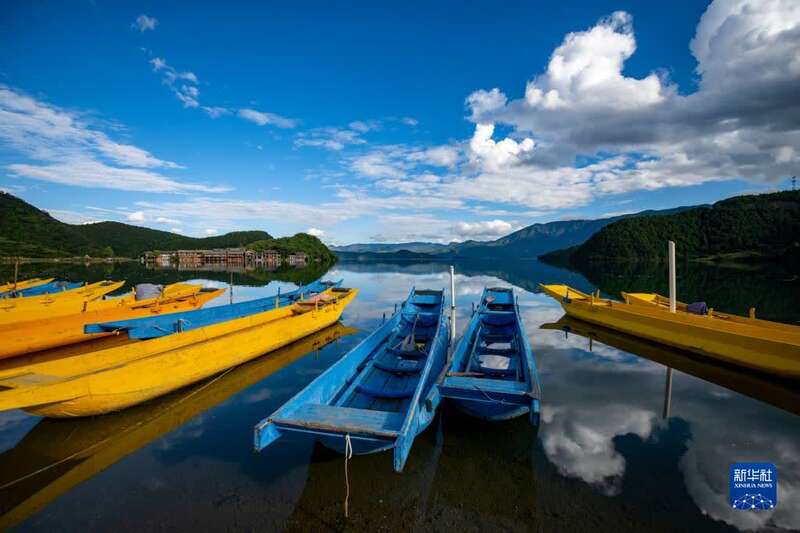 9月24日拍摄的停靠在泸沽湖畔的游船。新华社记者陈欣波摄