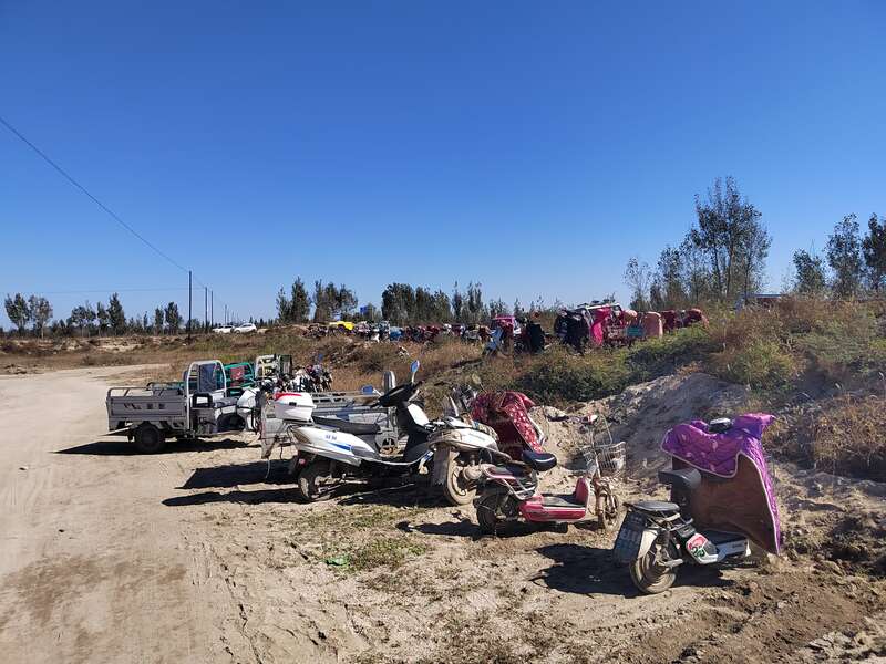 而在大沙河曲阳一侧,记者注意到桥面已经设置了土堆和围挡,并标有禁止通行的字样。在围挡以外停着成片的汽车、电动车、电动三轮。一位老人告诉记者,这都是去行唐县打工人的车。“每天早上,附近村至少有上千人到河对岸挖姜,一天130元。”老人介绍说,大部分人都是乘坐铲车过去,还有人拎着鞋、撸起裤脚从河里走。