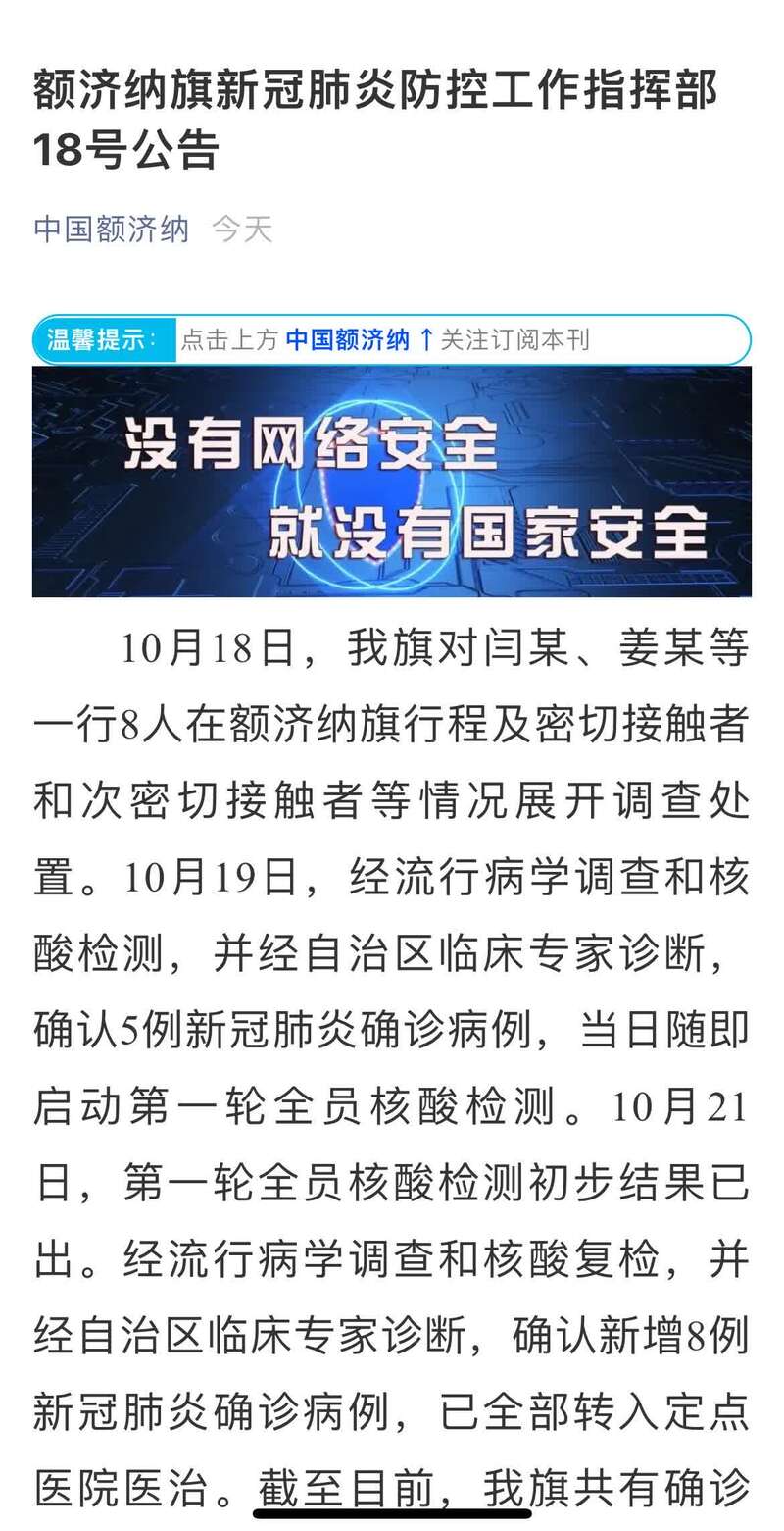 10月18日,额济纳旗对闫某、姜某等一行8人外省旅行团在额济纳旗行程及密切接触者和次密切接触者等情况展开调查处置。10月19日,经流行病学调查和核酸检测,并经内蒙古自治区临床专家诊断,确认5例新冠肺炎确诊病例。当日,额济纳旗随即启动第一轮全员核酸检测。10月21日,第一轮全员核酸检测初步结果已出,经流行病学调查和核酸复检,并经内蒙古自治区临床专家诊断,确认新增8例新冠肺炎确诊病例,已全部转入定点医院医治。