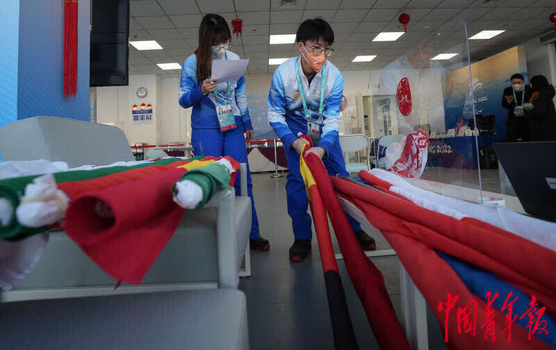 3月3日,北京2022年冬残奥会张家口赛区国家冬季两项中心,志愿者整理各代表团旗帜,为悬挂礼宾旗帜做准备。中青报·中青网记者 李峥苨/摄
