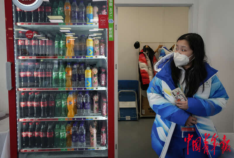 3月3日,北京2022年冬残奥会张家口赛区国家冬季两项中心,工作人员在饮料柜内不同高度都放置了所有种类的饮料,在坐姿状态下也能方便地挑选。中青报·中青网记者 李峥苨/摄